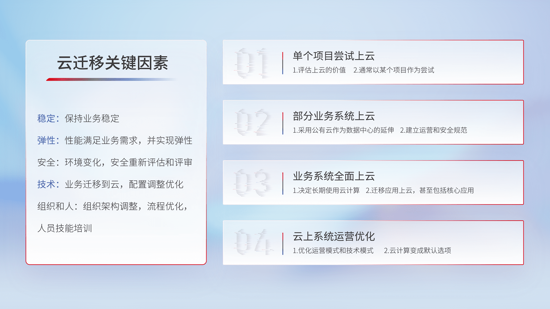结合实际业务,,从规划设计、、云平台选型、、、云原生改造、、、、数据迁移、、、集成交付,,,迁移全过程为客户识别最佳上云路径,,做好风险识别管理,,,,设计网络架构、、、、身份权限、、安全审计合规、、操作审计、、、日志审计、、、、监控告警策略、、、、多站点容灾设计等,,对云上基础设施进行整体规划,,,提升IT治理水平,,,以满足弹性、、、高可用、、高性能的需求。。
